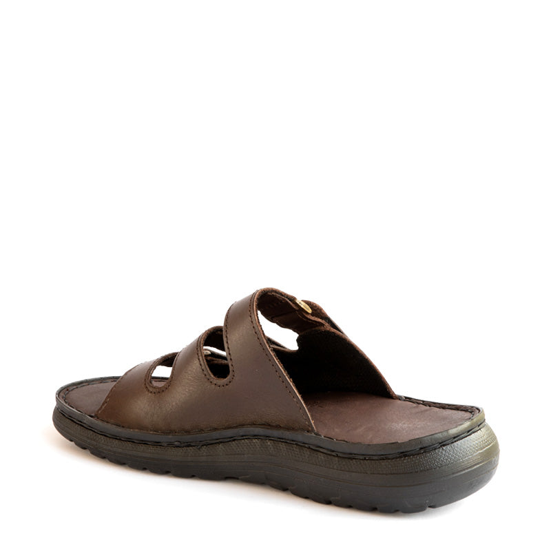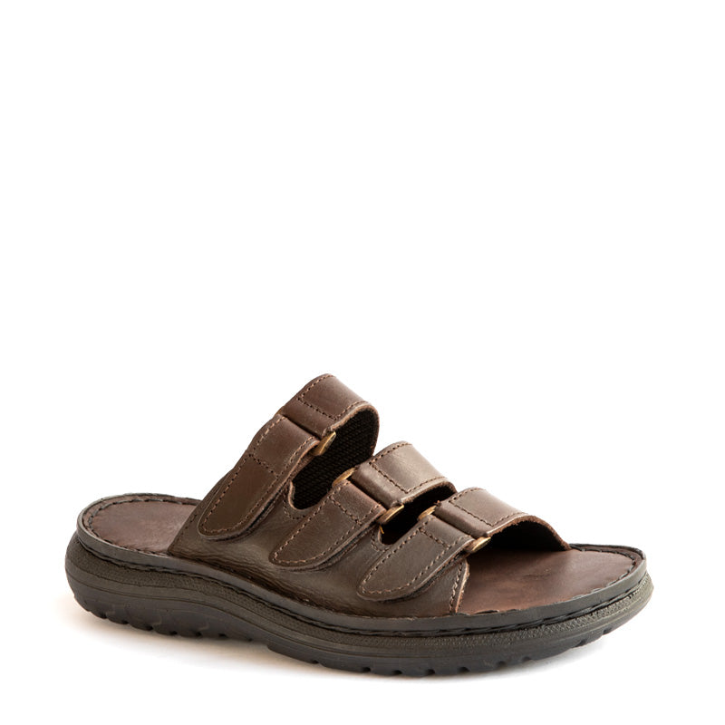 Comfort slip-on sandal: 3 velcro, adjustable straps, hand-laced, foam-padded leather insole