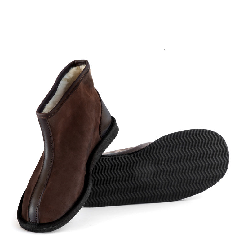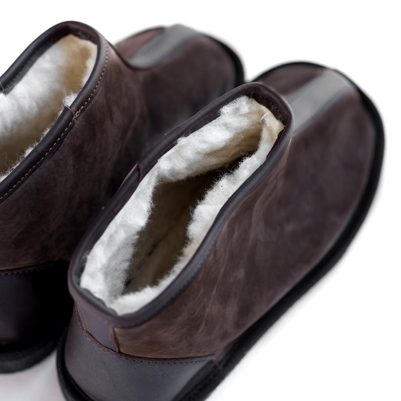 Warm winter boot that can be used both indoors and outdoors. This item has a simple yet effective construction with wide and soft throat allows your foot to easily slide in. The boot is fully lined with genuine wool which has been reconstituted onto a cloth backer, this is laminated to a soft suede-split leather and built on a durable chevron wedge EVA sole. Looking for design with a higher ankle? Check out the high boot.